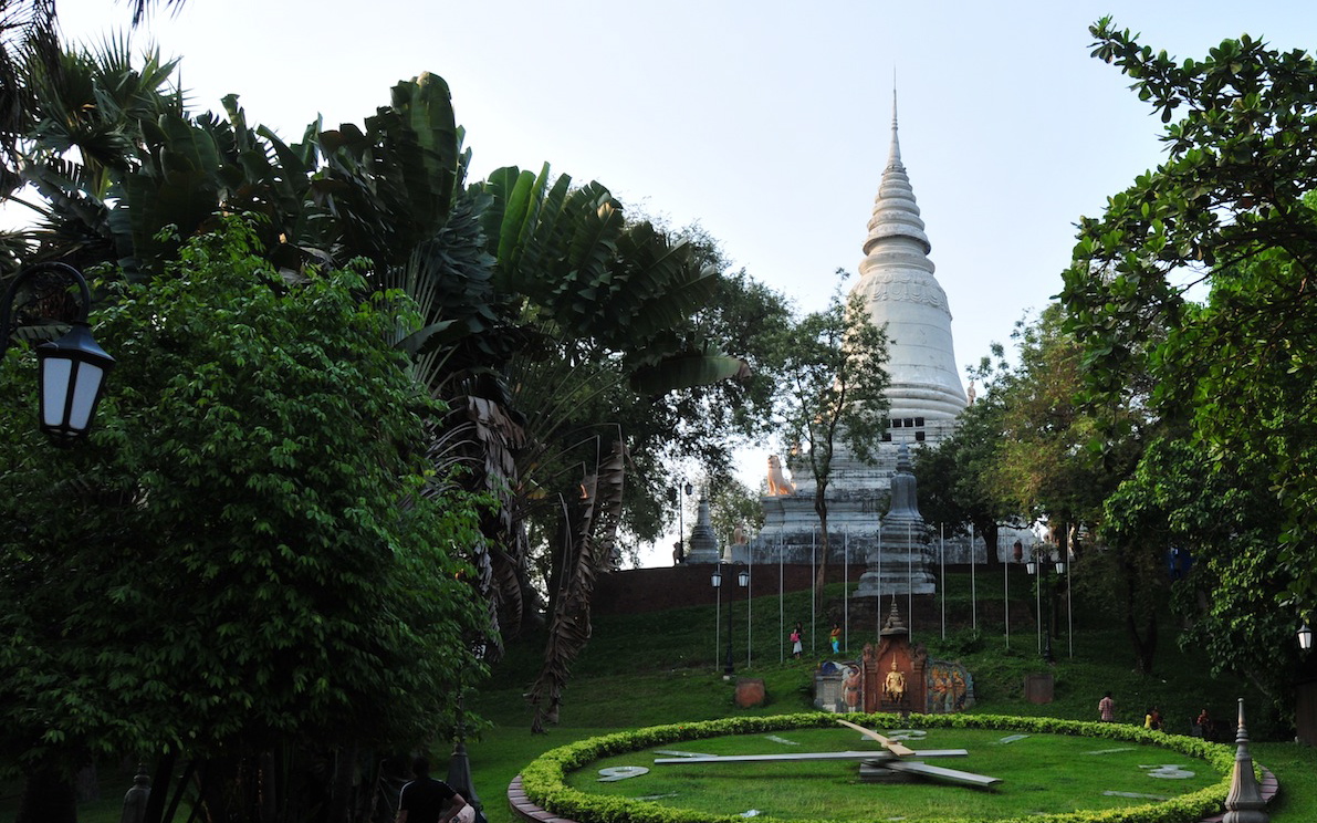 Ein weißer Chedi mit Löwen als Wächter und eine Uhr aus Gras.