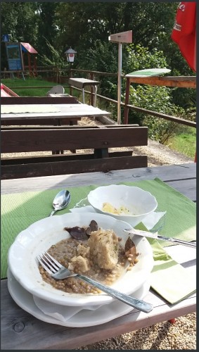 Zum Mittagessen bei der Schutzhütte Waxeneck mit Blick auf den Schneeberg
