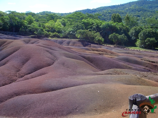 Auf der siebenfarbigen Erde bei Chamarel wächst keine Pflanze. Angeblich weiß man nicht, warum dort nichts wächst. Eine Schautafel vor Ort versucht es mit einer chemischen Erklärung. Dabei ist das doch völlig klar, da laufen nachts die Sprayer rum.