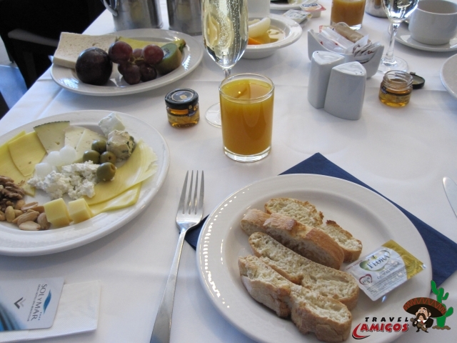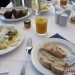 Mein Standard-Frühstück im Hotel Solymar, Calpe an der Costa Blanca, Spanien. Käseplatte mit Oliven und Nüssen, Obstteller, Honig, Baguette, Kaffee, Saft, Prosecco.