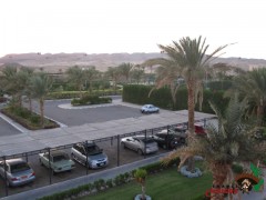 Blick über den Parkplatz zu den Tennsiplätzen, Openairkino, Beachvolleyballplätzen und Fußballplatz (rechts)