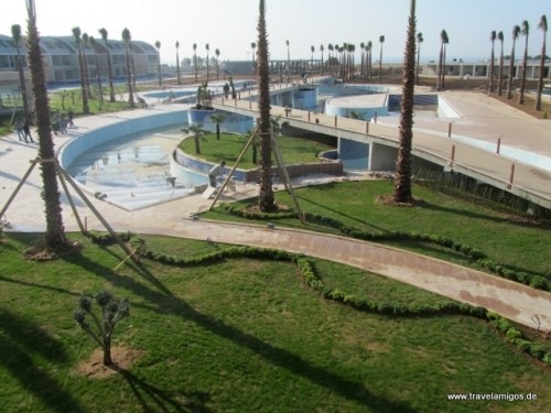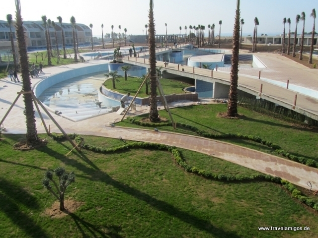 Blick über die Anlage - einige Palmen und Büsche sind gepflanzt, Rasen ist teilweise schon gesäht, der Pool fast fertig.
