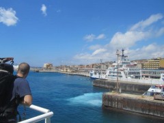 Die Überfahrt nach Messina dauerte ca. 30 Minuten und in der Zeit kann man den Zug auch verlassen und über schmale Treppen nach oben ans Deck der Fähre, wo es eine kleine Bar mit einfachen Snacks und Getränken gibt. Ich wollte mein Gepäck nicht so lange alleine lassen und beließ es bei einem kurzen Sprint nach Oben, einer Zigarette im Freien und einem Bier aus Villa San Giovanni zum Mitnehmen.